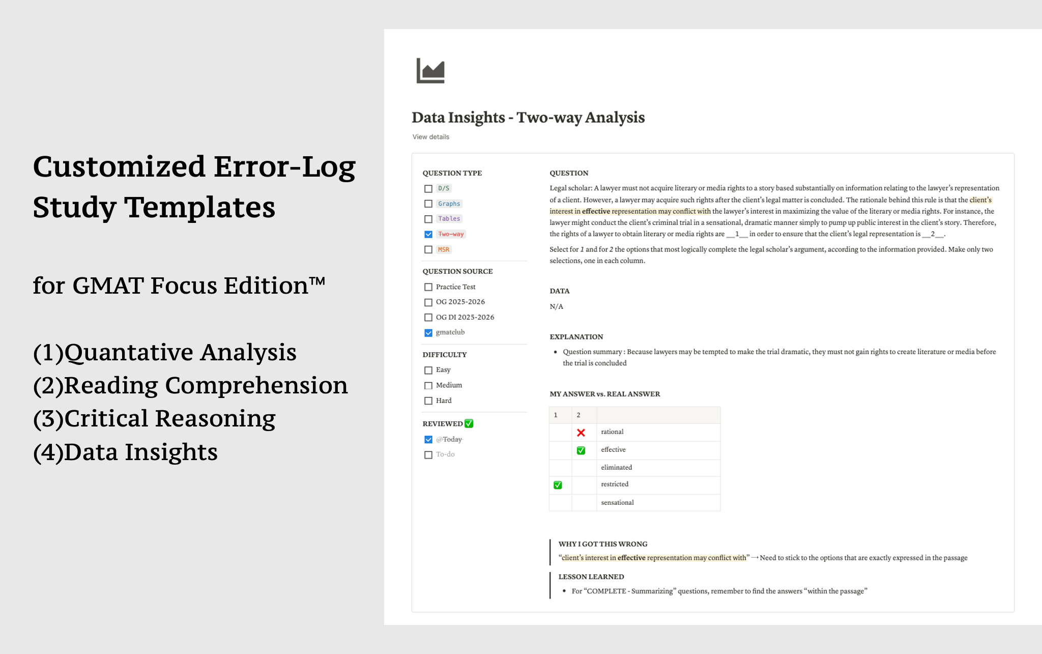 It’s designed to help you stay organized and intentional. You can log questions by section (Quant, Verbal, Data Insights) and by type (like Data Sufficiency, Reading Comprehension, or Graph Analysis) — so you can actually see where you’re improving, and where to focus next.